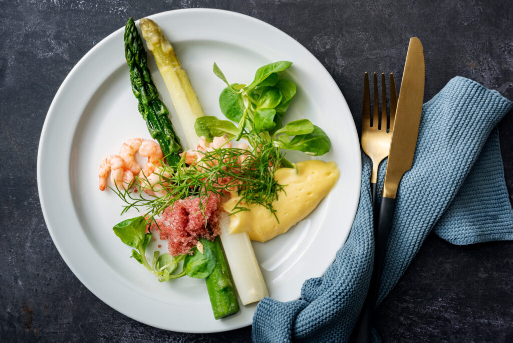Friske asparges med hollandaiseskum på feltsalat herpå rejer og friteret persille